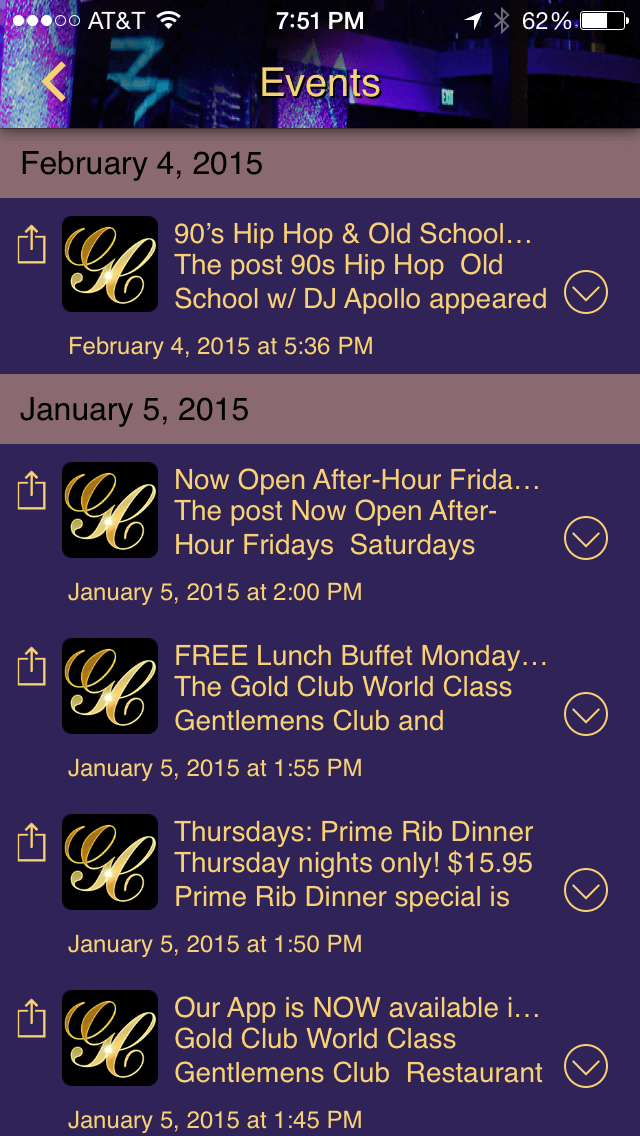 Since neither Google Play nor iTunes allows adult entertainment apps in their stores, I designed and organized the content of the Gold Club SF app to display the establishment as a dance club and bar.